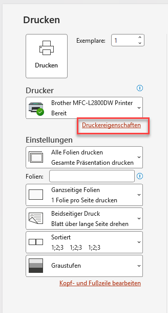 1. Es ist auf Druckereigenschaften zu drücken innerhalb der Druckansicht von PowerPoint